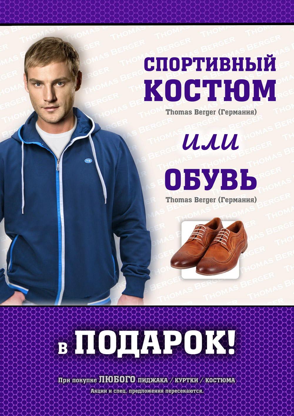 Только сейчас при покупке любого пиджака, куртки или костюма получите СПОРТИВНЫЙ КОСТЮМ или ОБУВЬ Thomas Berger В ПОДАРОК! Удобство, комфорт и ваш уникальный стиль в магазинах Thomas Berger! 21.07.2016 |